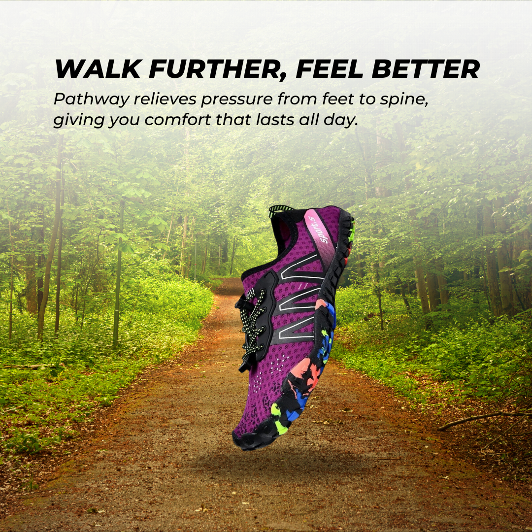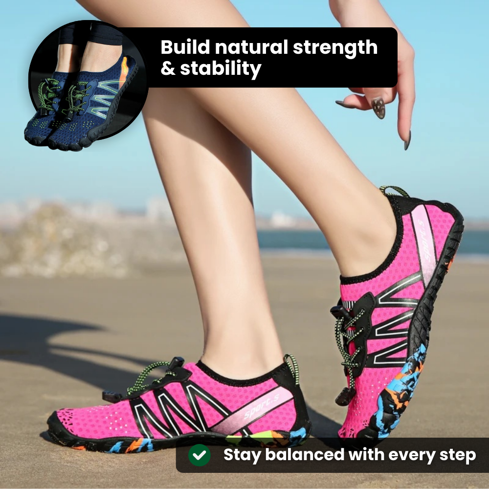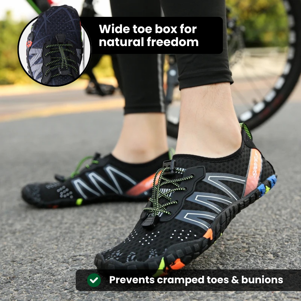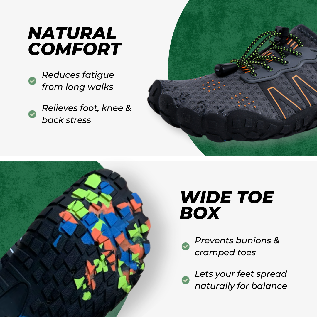 Våra barfotaskor har en bred tåbox som håller tårna i linje och lindrar trycket på lederna, vilket hjälper dina fötter att återgå till sin naturliga position så att gången känns lättare och smärtfri.