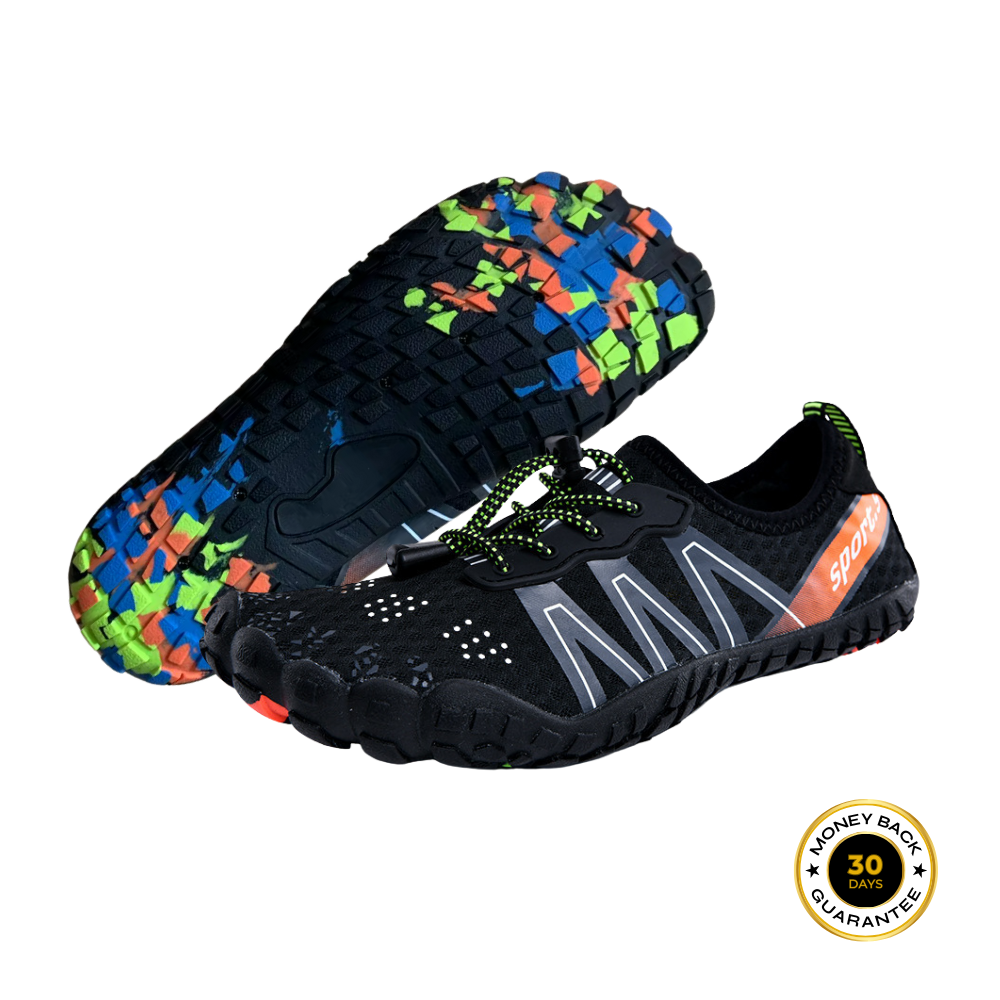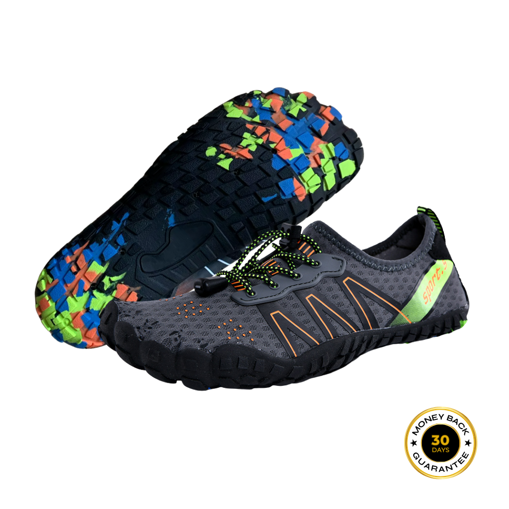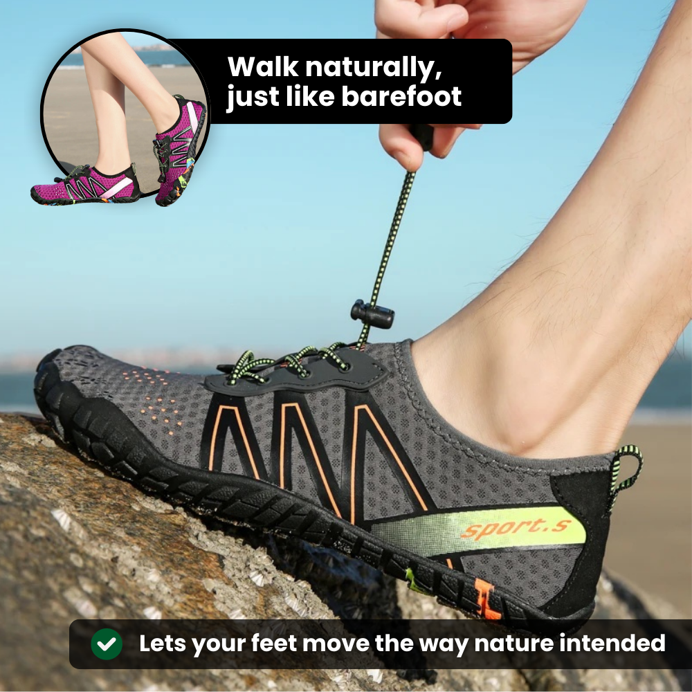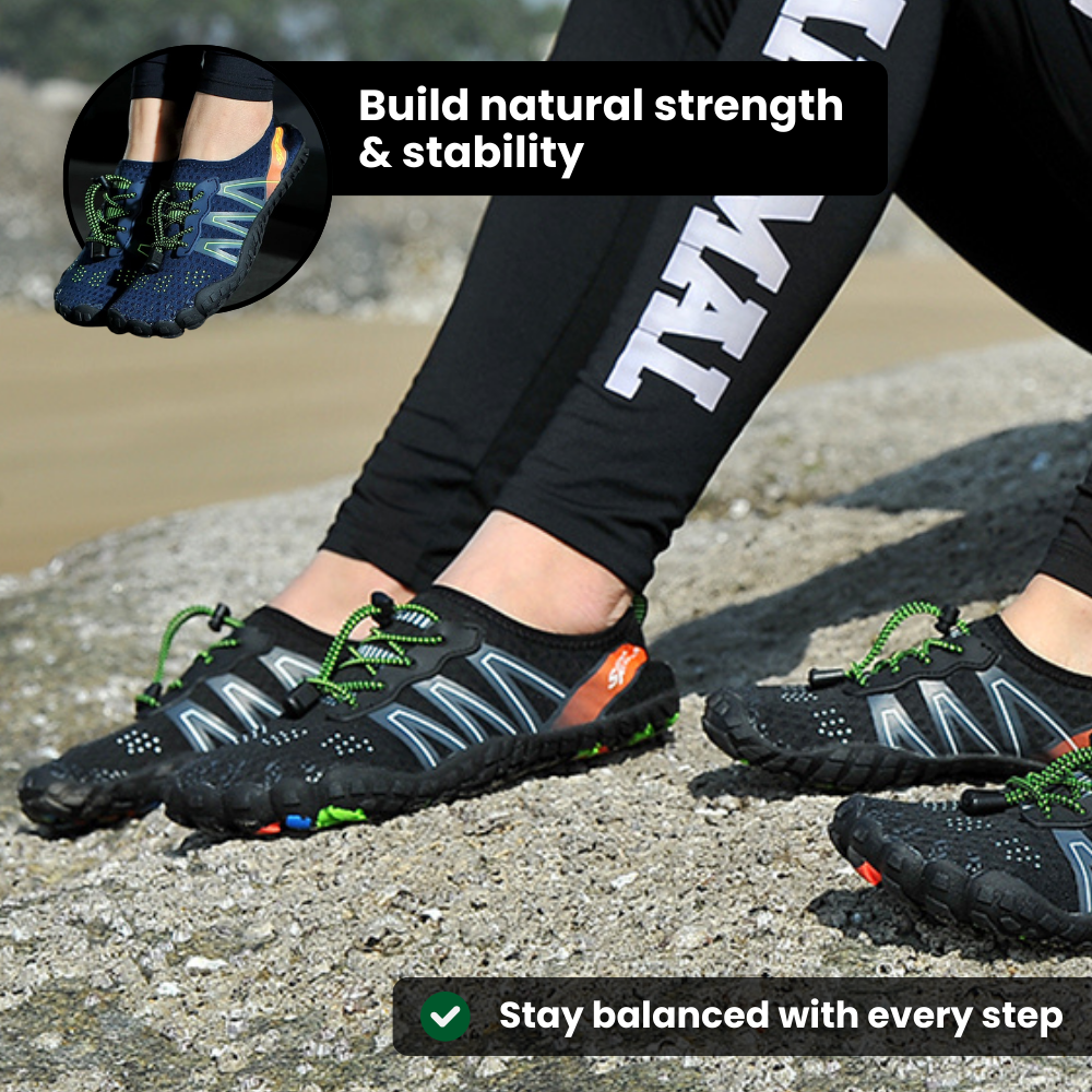 Våra barfotaskor har en bred tåbox som håller tårna i linje och lindrar trycket på lederna, vilket hjälper dina fötter att återgå till sin naturliga position så att gången känns lättare och smärtfri.