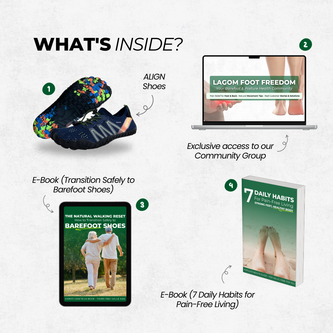 👉 Det här är inte bara ett par skor – det är en komplett lösning för hälsosammare rörelser och långsiktig komfort. Allt du behöver för att börja gå naturligt, leva smärtfritt och känna dig självsäker igen – allt i ett paket.