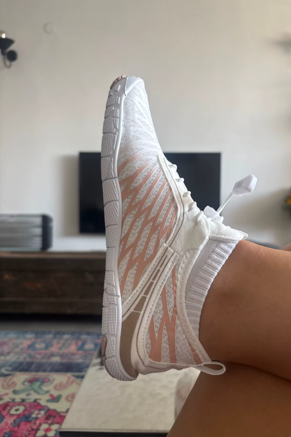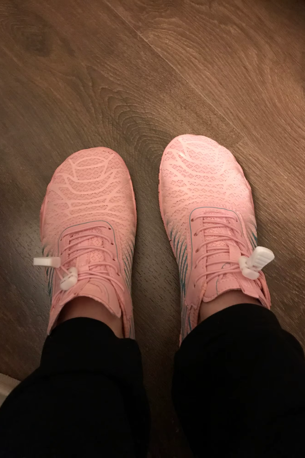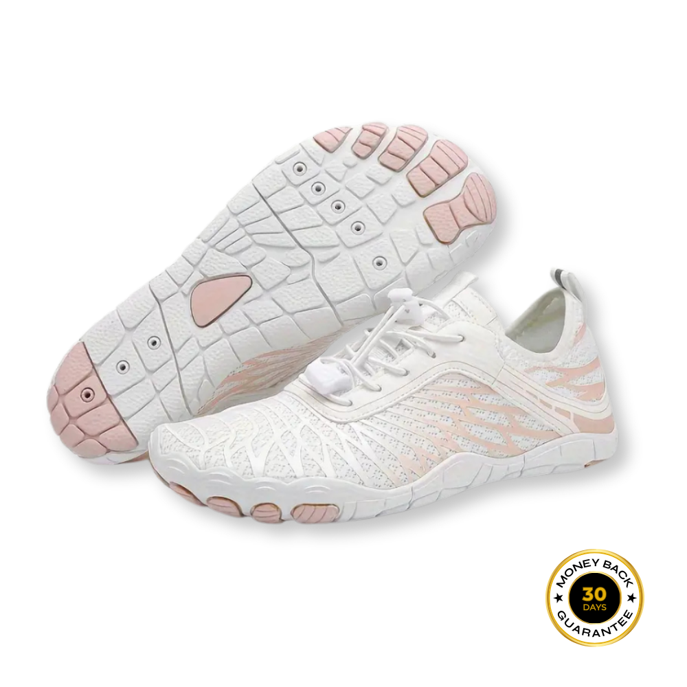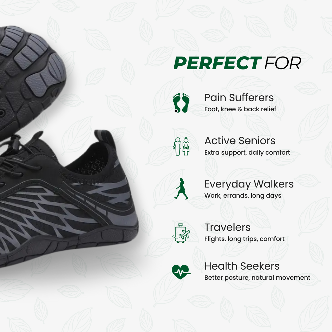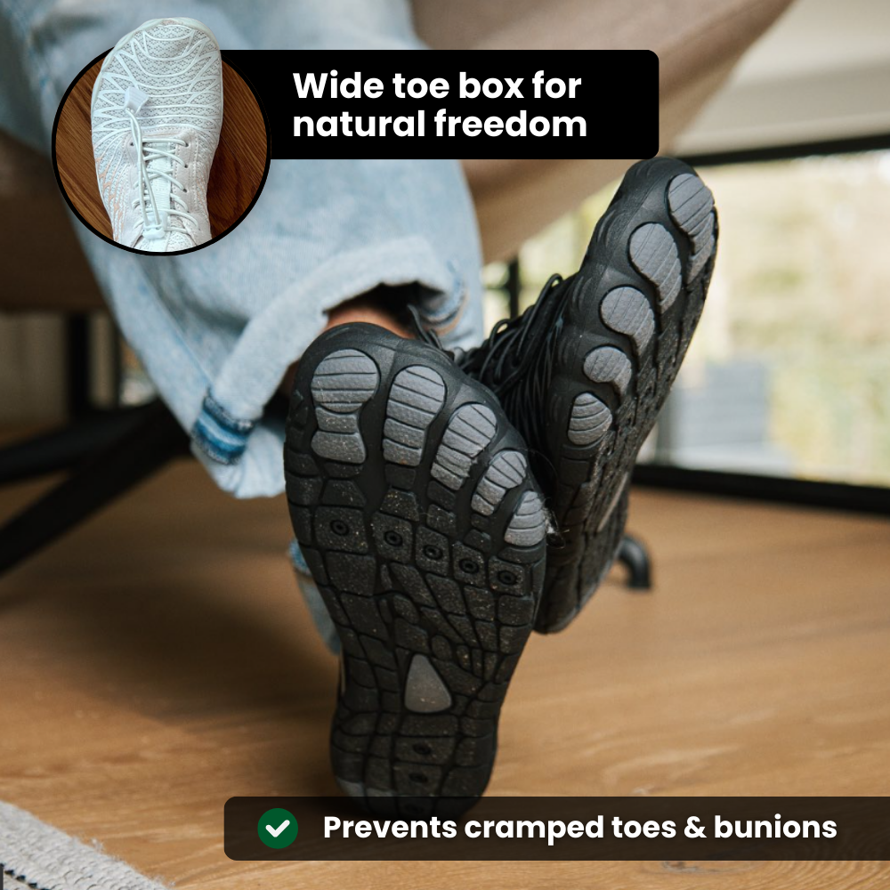 Våra barfotaskor har en bred tåbox som håller tårna i linje och lindrar trycket på lederna, vilket hjälper dina fötter att återgå till sin naturliga position så att gången känns lättare och smärtfri.