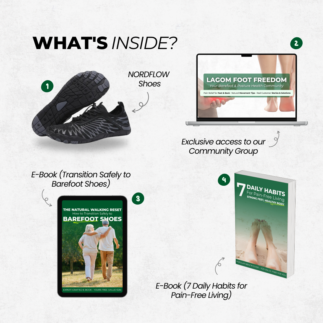 Kliv in i friheten och komforten med Nordic Flow barfotaskon – kärnan i detta kompletta paket. Nordflow är designad för personer som vill ha friskare fötter, bättre hållning och smärtfri rörelse, och kombinerar skandinavisk enkelhet med beprövade fördelar för fothälsan. Oavsett om du promenerar på jobbet, utforskar utomhus eller helt enkelt söker lindring från dagligt obehag, anpassar sig denna sko till din livsstil.