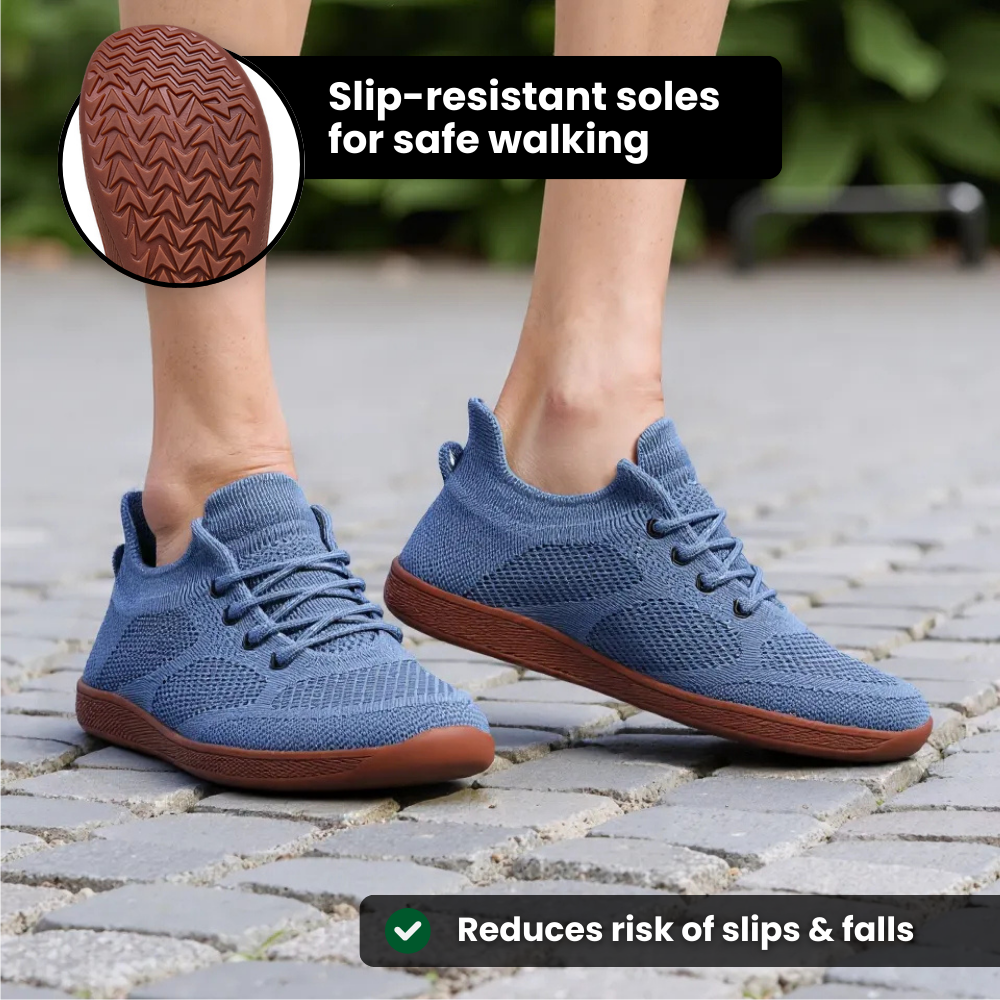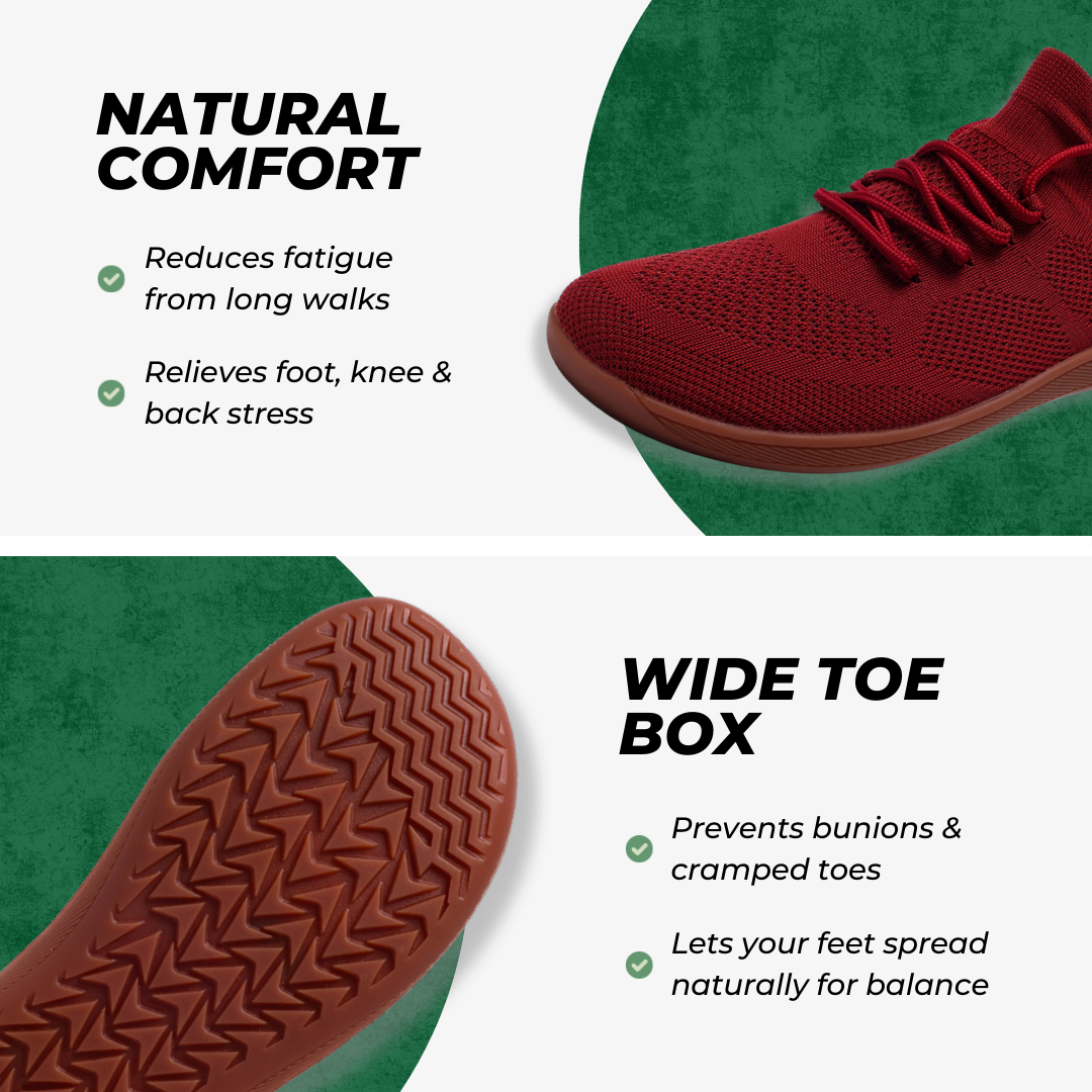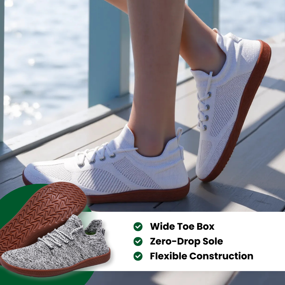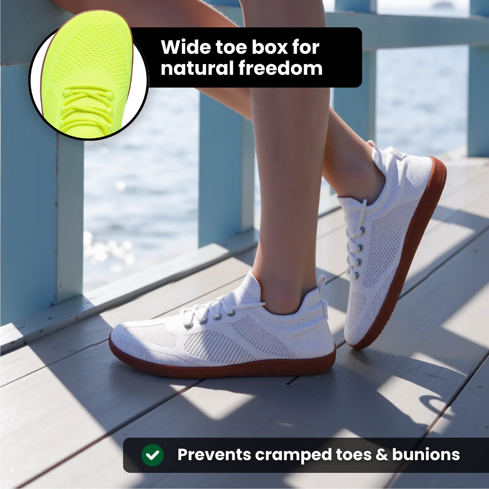 Våra barfotaskor har en bred tåbox som håller tårna i linje och lindrar trycket på lederna, vilket hjälper dina fötter att återgå till sin naturliga position så att gången känns lättare och smärtfri.